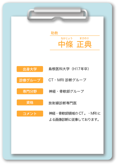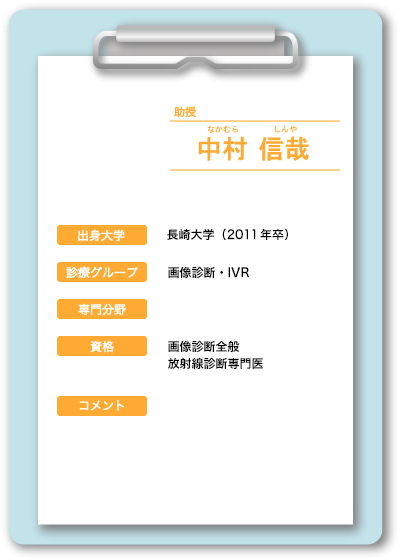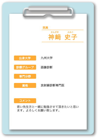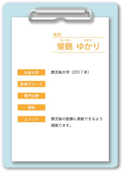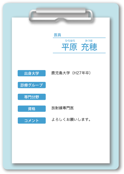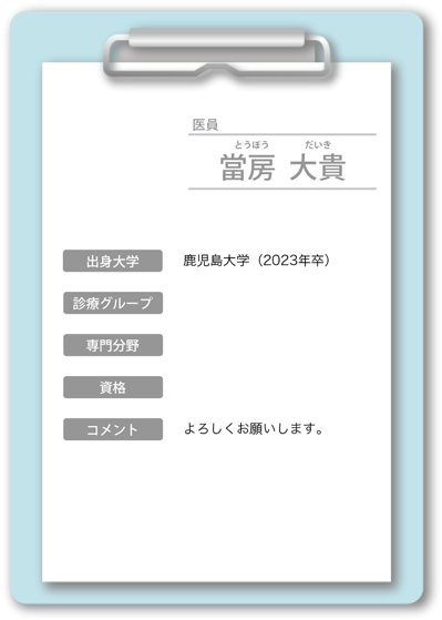 中山 博史(なかやま ひろふみ) 中村 文彦(なかむら ふみひこ) 永里 耕平(ながさと こうへい) 神園 純輝(かみぞの じゅんき) 日髙 誠也(ひだか せいや) 名ヶ迫 強(みょうがさこ つよし) 向井 晶絵(むかい あきえ) 中別府 良昭(なかべっぷ よしあき)嘱託医 |
